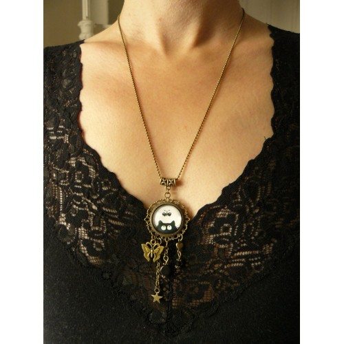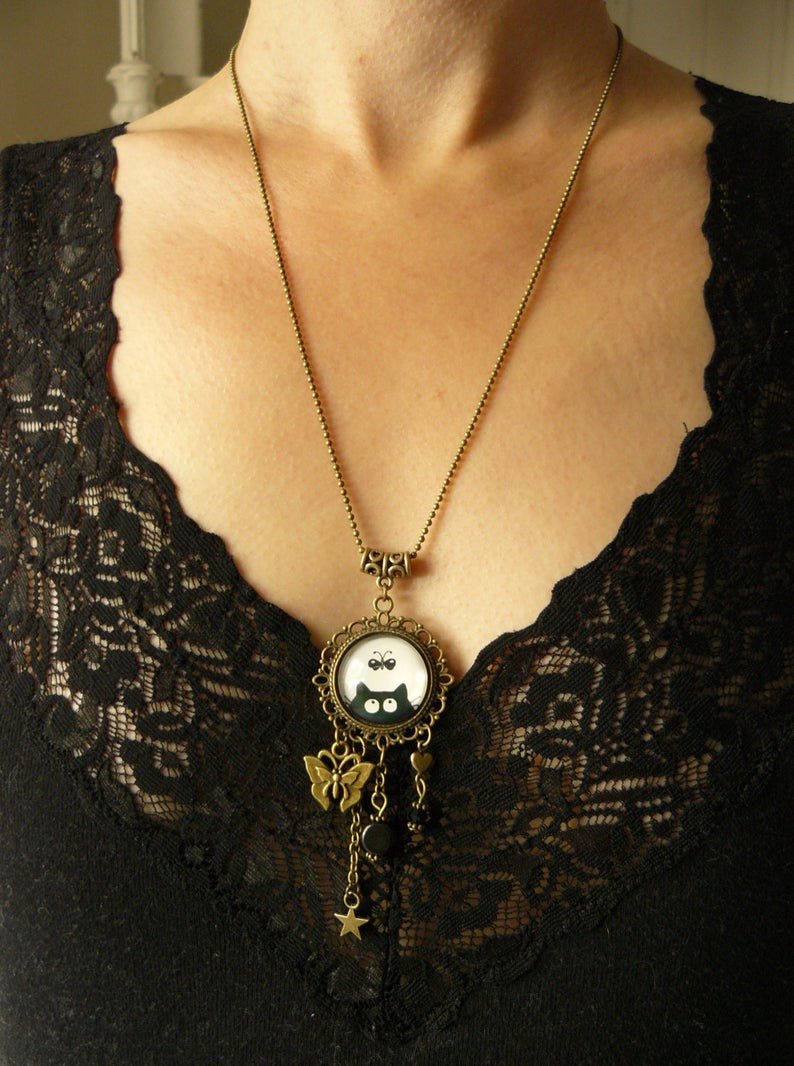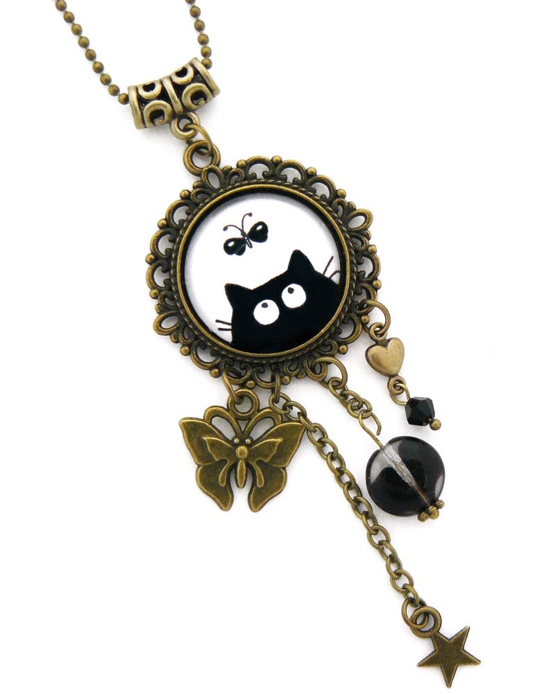 Monté sur une chaîne réglable à billes en métal de couleur bronze, ce bijou allie élégance vintage et poésie féline.