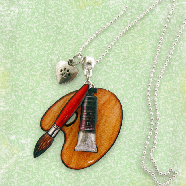 Pendentif artiste – palette, pinceau et tube de peinture en résine, coeur en métal argenté, chaîne réglable acier inoxydable