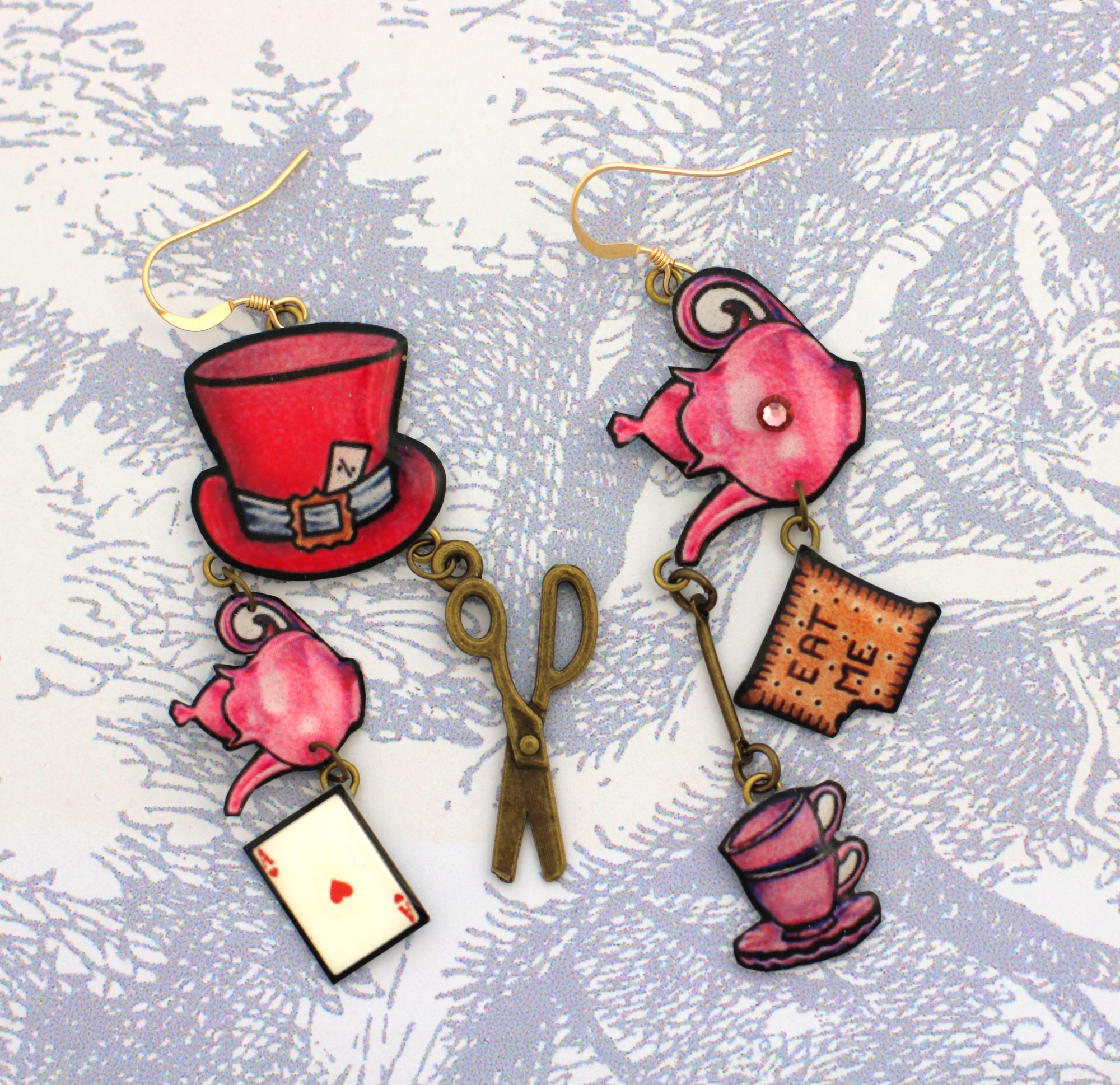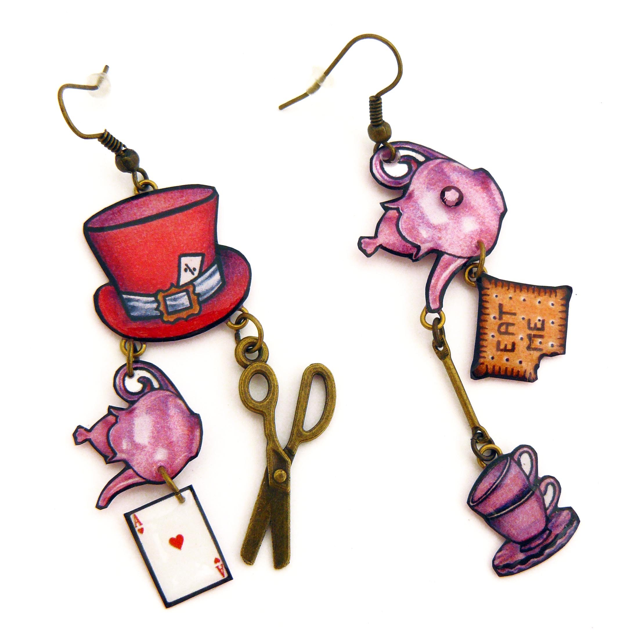 🐰Boucles d’oreilles Alice au Pays des Merveilles – Chapeau, tasses, théières et ciseaux en résine et métal bronze, strass rose antique