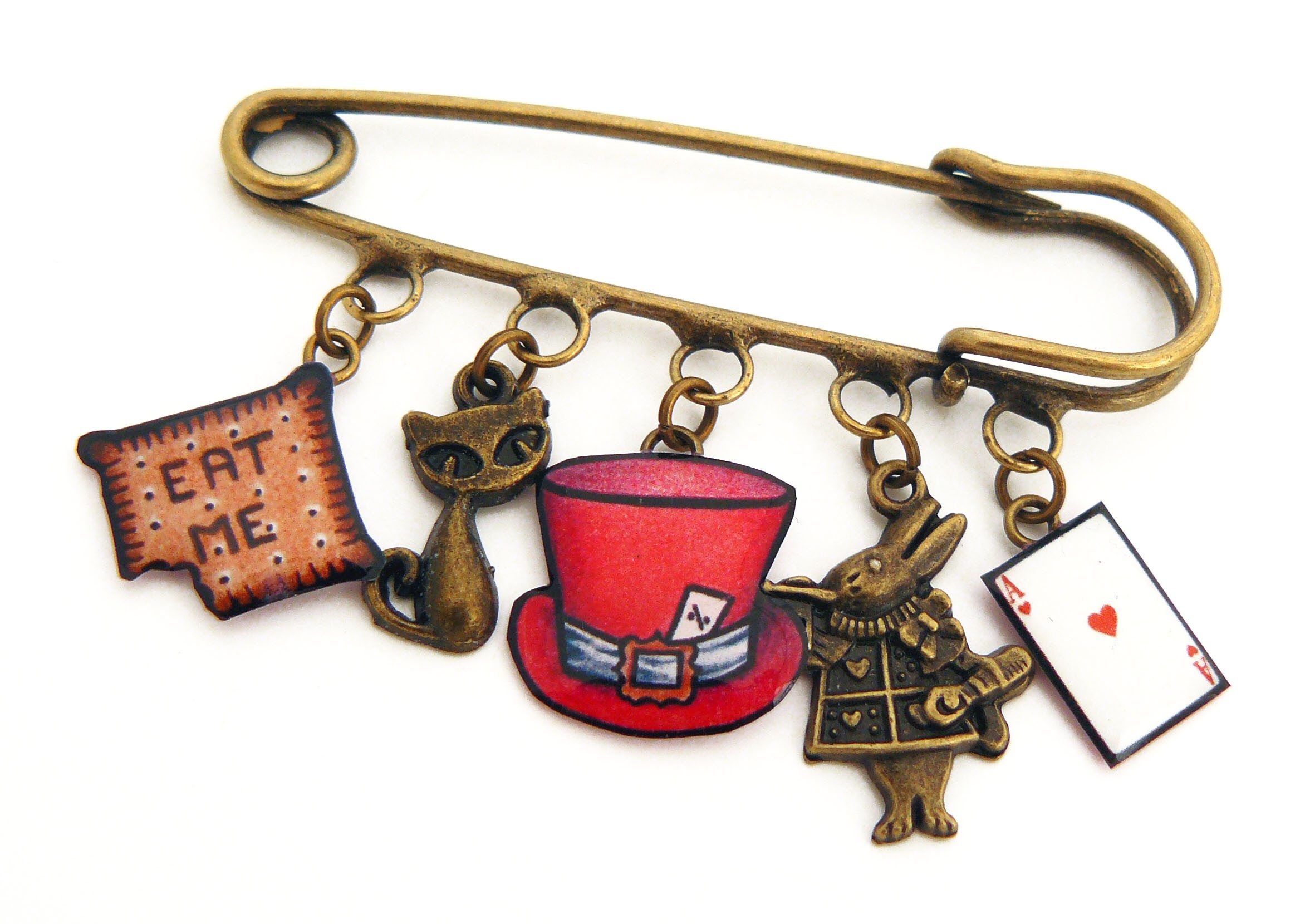 Broche Alice au Pays des Merveilles – Gâteau “Eat Me”, chapeau, as de cœur, chat et lapin en métal et résine✨