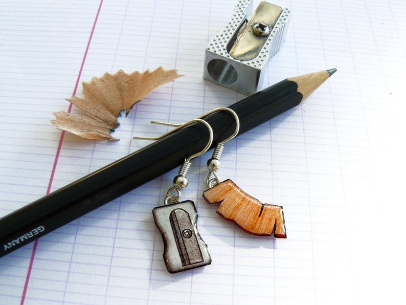 🌟Boucles d’oreilles taille-crayon et pelure de crayon en résine – Bijou original et coloré, idée cadeau pour maîtresse d’école
