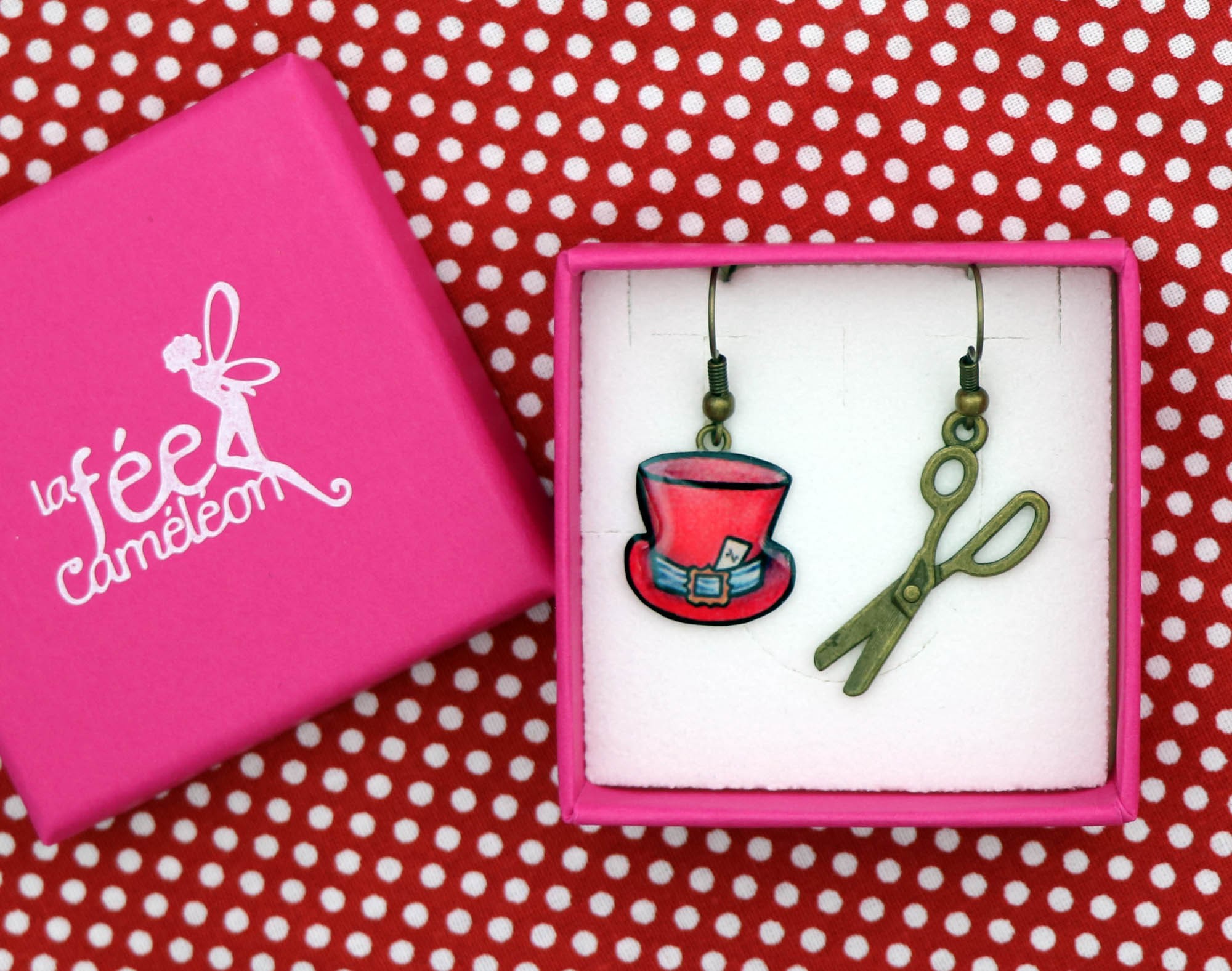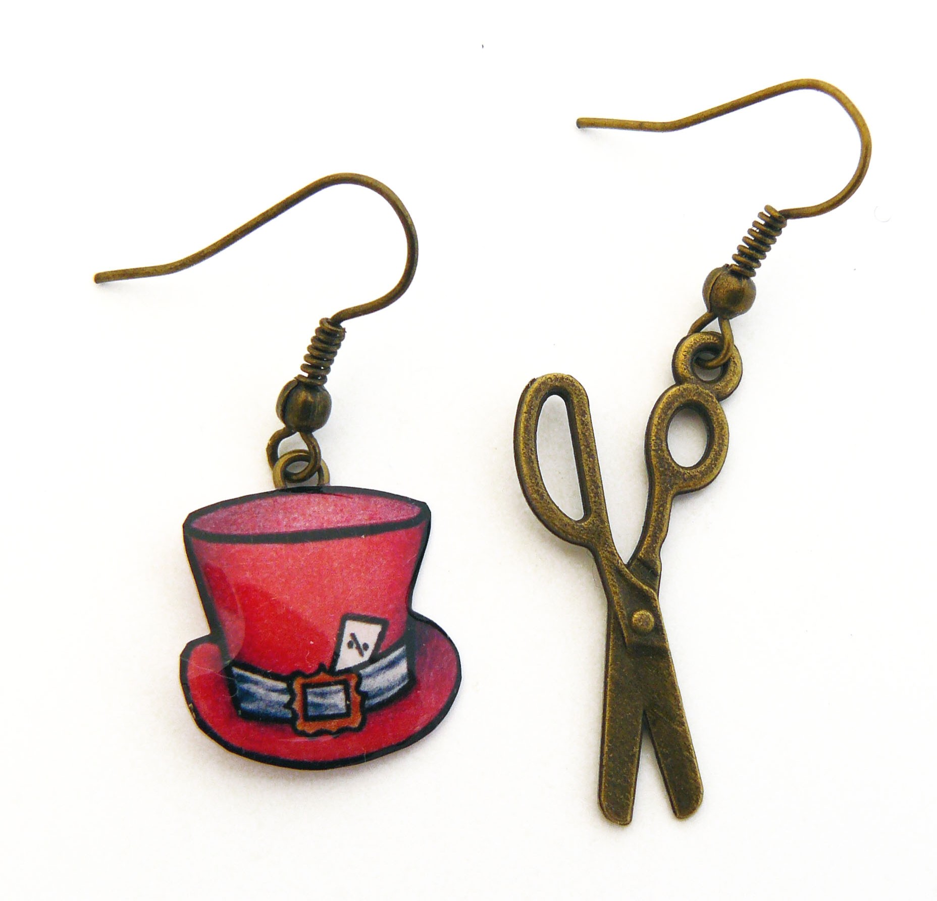 🐰Boucles d’oreilles Alice au Pays des Merveilles – Chapeau du Chapelier et ciseaux en bronze, bijou dépareillé original