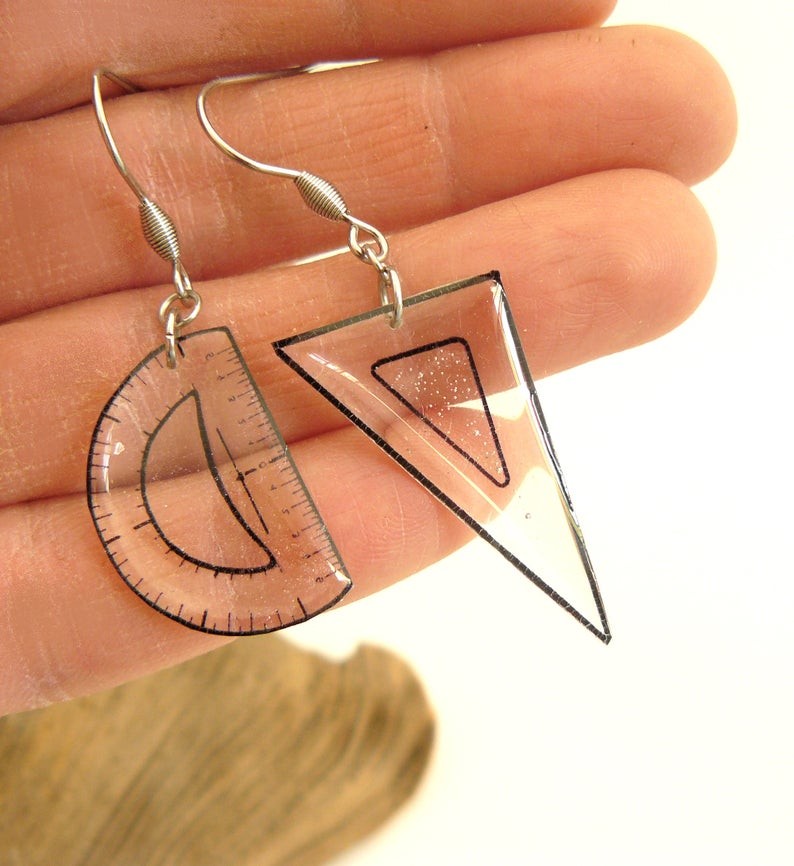 🌟Boucles d’oreilles équerre et rapporteur en résine transparente – Cadeau original pour maîtresse ou prof de mathématiques