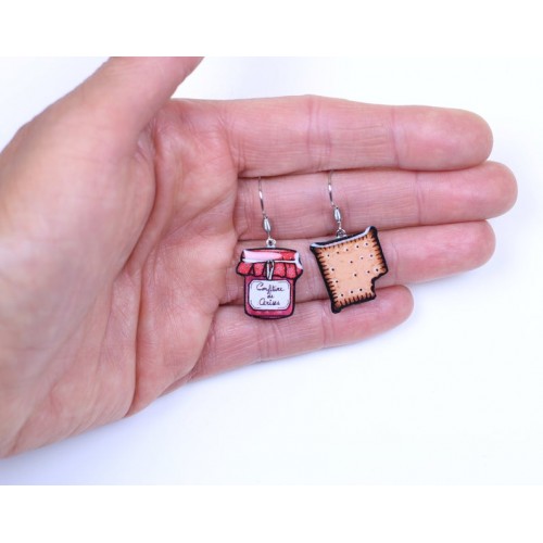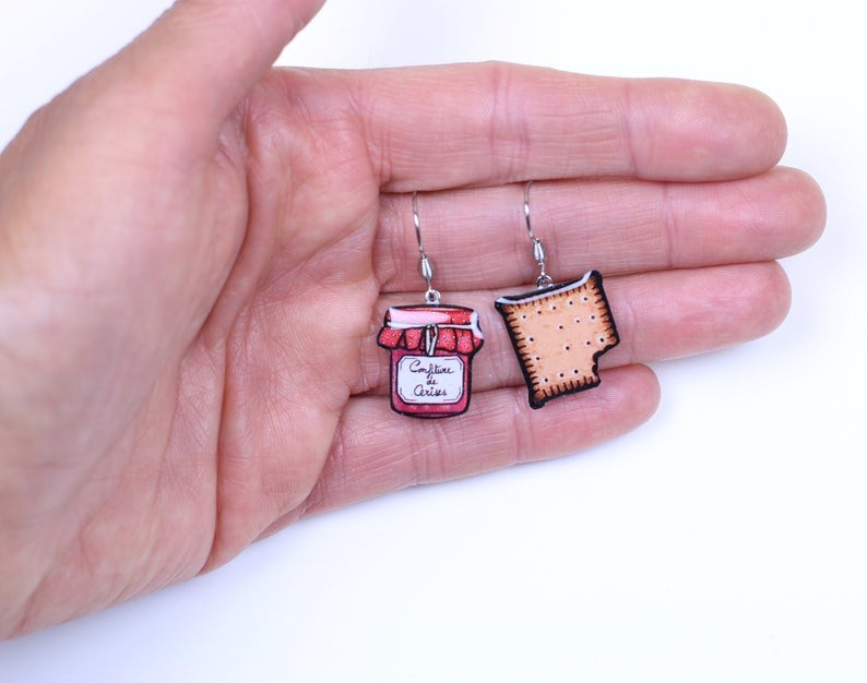 Ces boucles d’oreilles ultra-gourmandes évoquent la douceur d’un goûter maison : un pot de confiture de cerise bien brillante et un petit gâteau croqué à souhait.