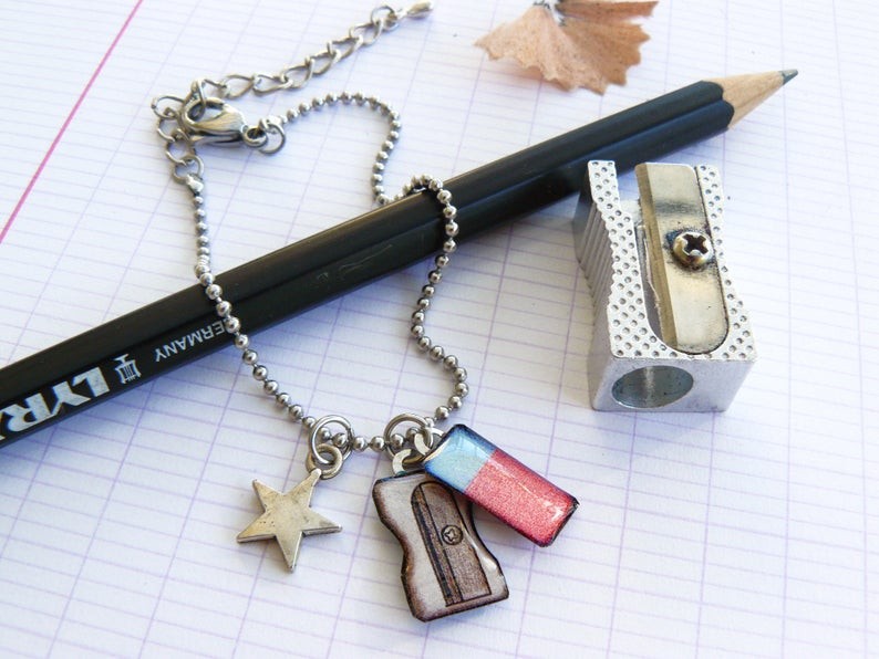 Ce bracelet réglable associe une chaîne à billes argentée à deux petits pendentifs en résine représentant une gomme et un taille-crayon, accompagnés d’une étoile en métal argenté pour une touche lumineuse.