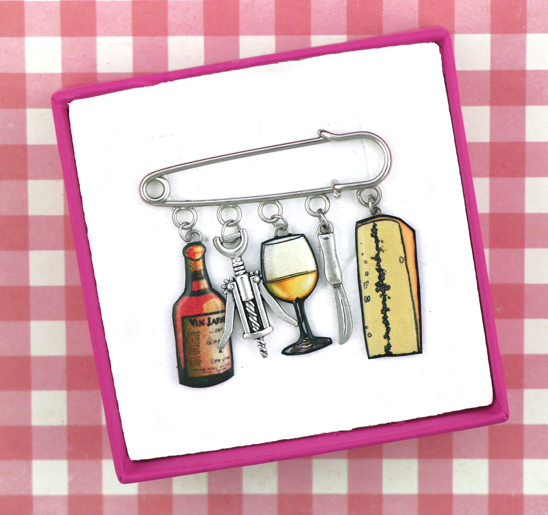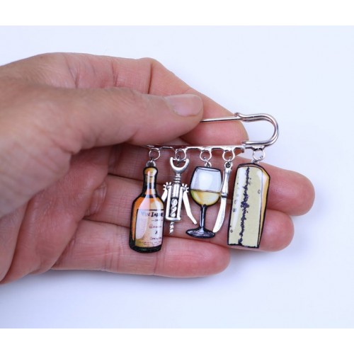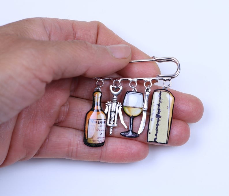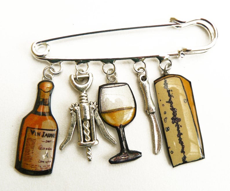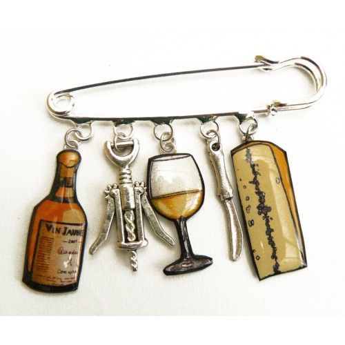 Affichez fièrement vos racines comtoises (ou votre amour du bon goût !) avec cette broche originale inspirée des trésors du terroir : une bouteille de vin jaune, un morceau de Morbier, un verre et un tire-bouchon.