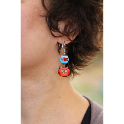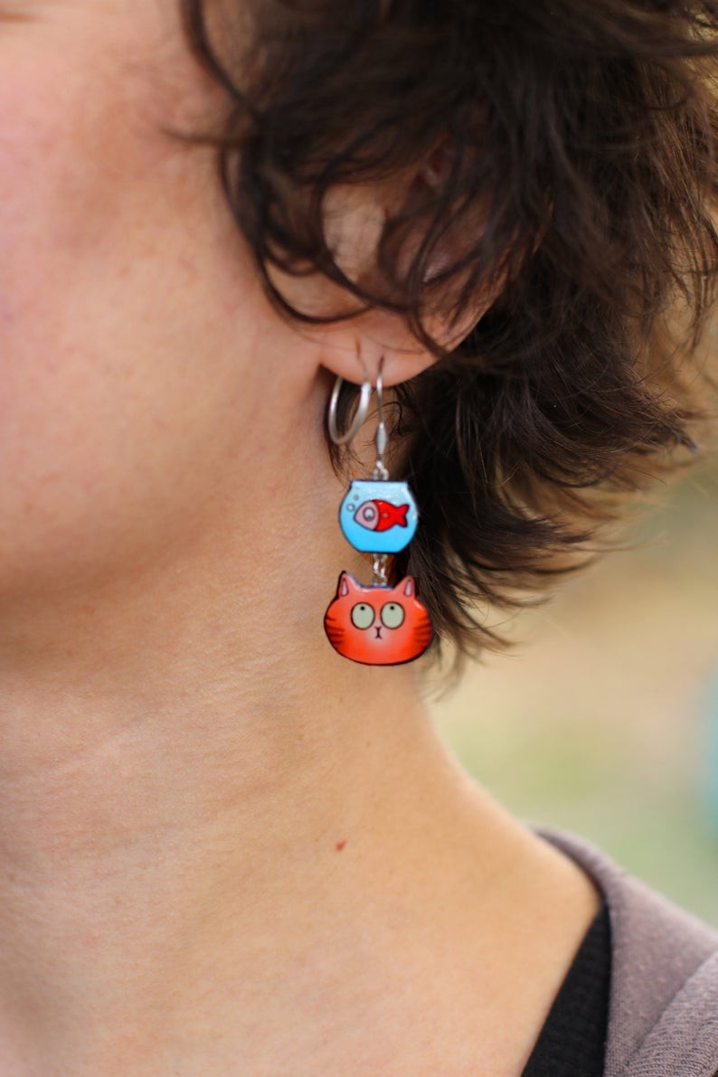 Apportez humour et originalité à votre style avec ces boucles d’oreilles dépareillées artisanales : un chat roux espiègle lorgnant sur un poisson rouge en résine.
