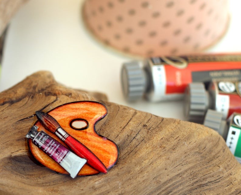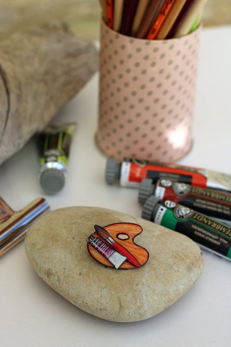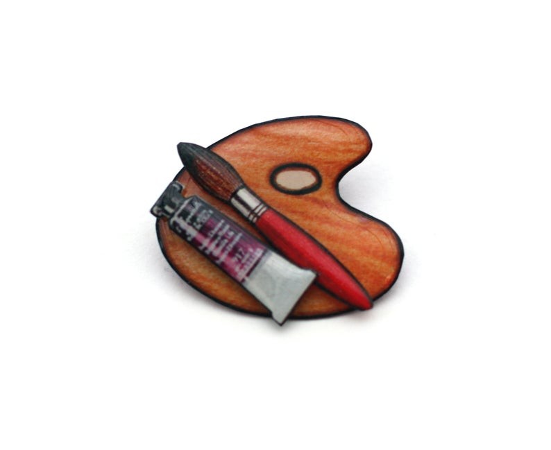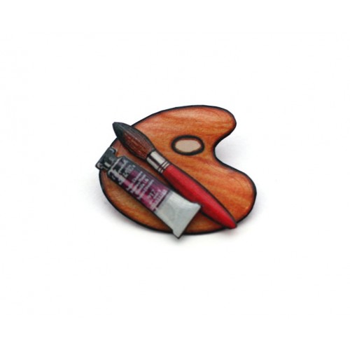 Exprimez votre créativité avec ce pin’s artisanal en résine, représentant une palette de peinture, un pinceau et un tube de peinture.