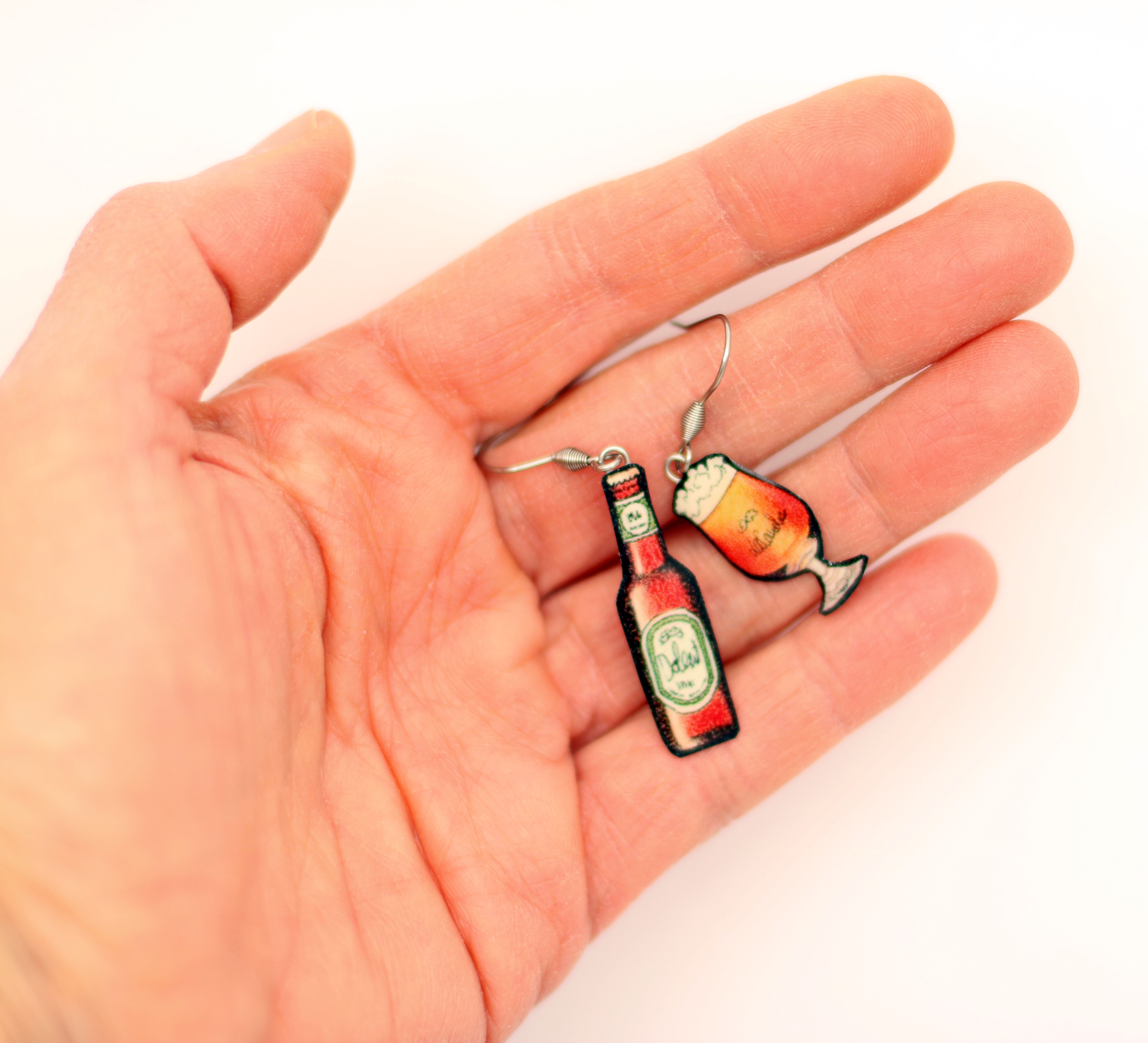 Boucles d’oreilles dépareillées en résine (1 bouteille + 1 verre de bière)