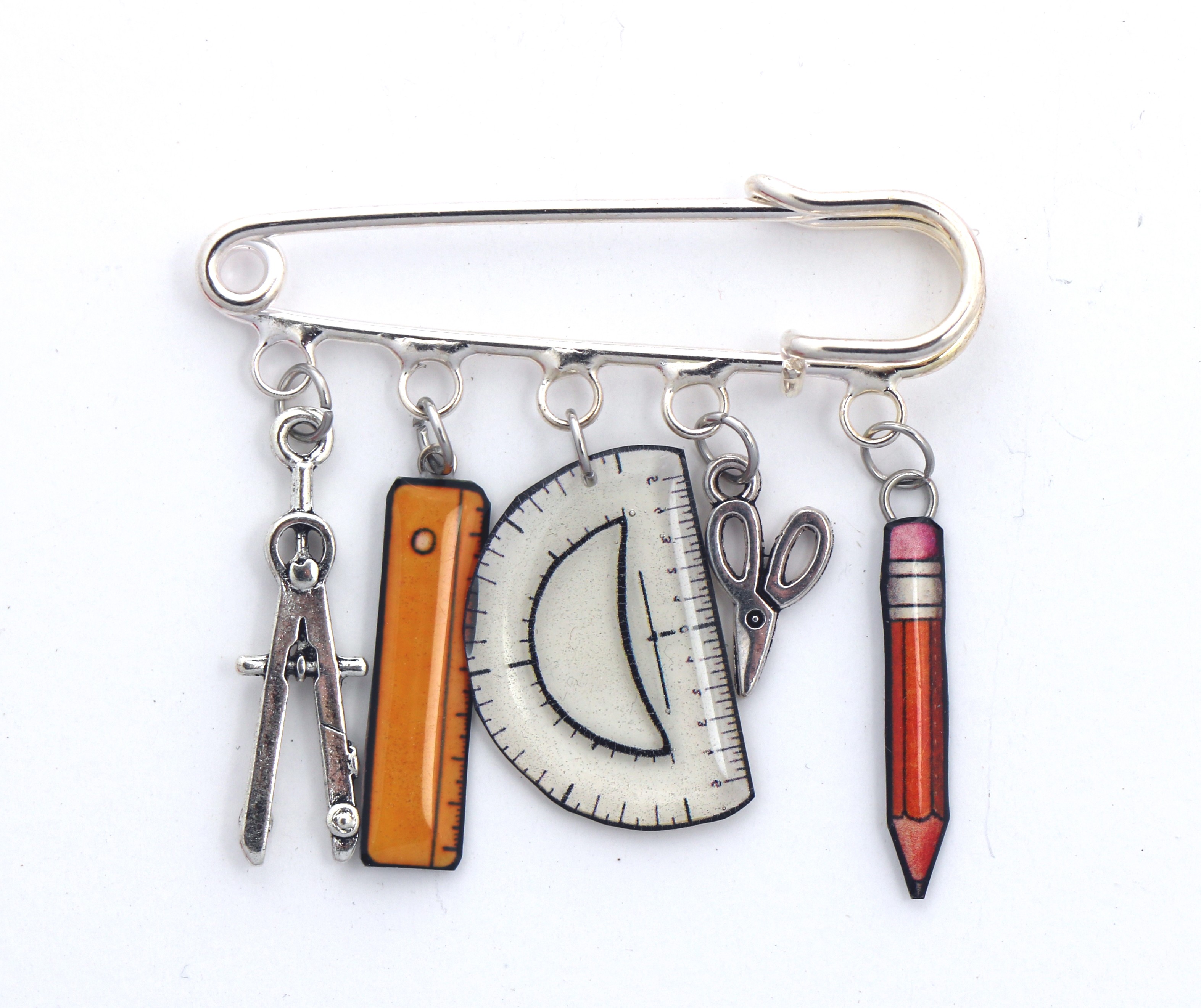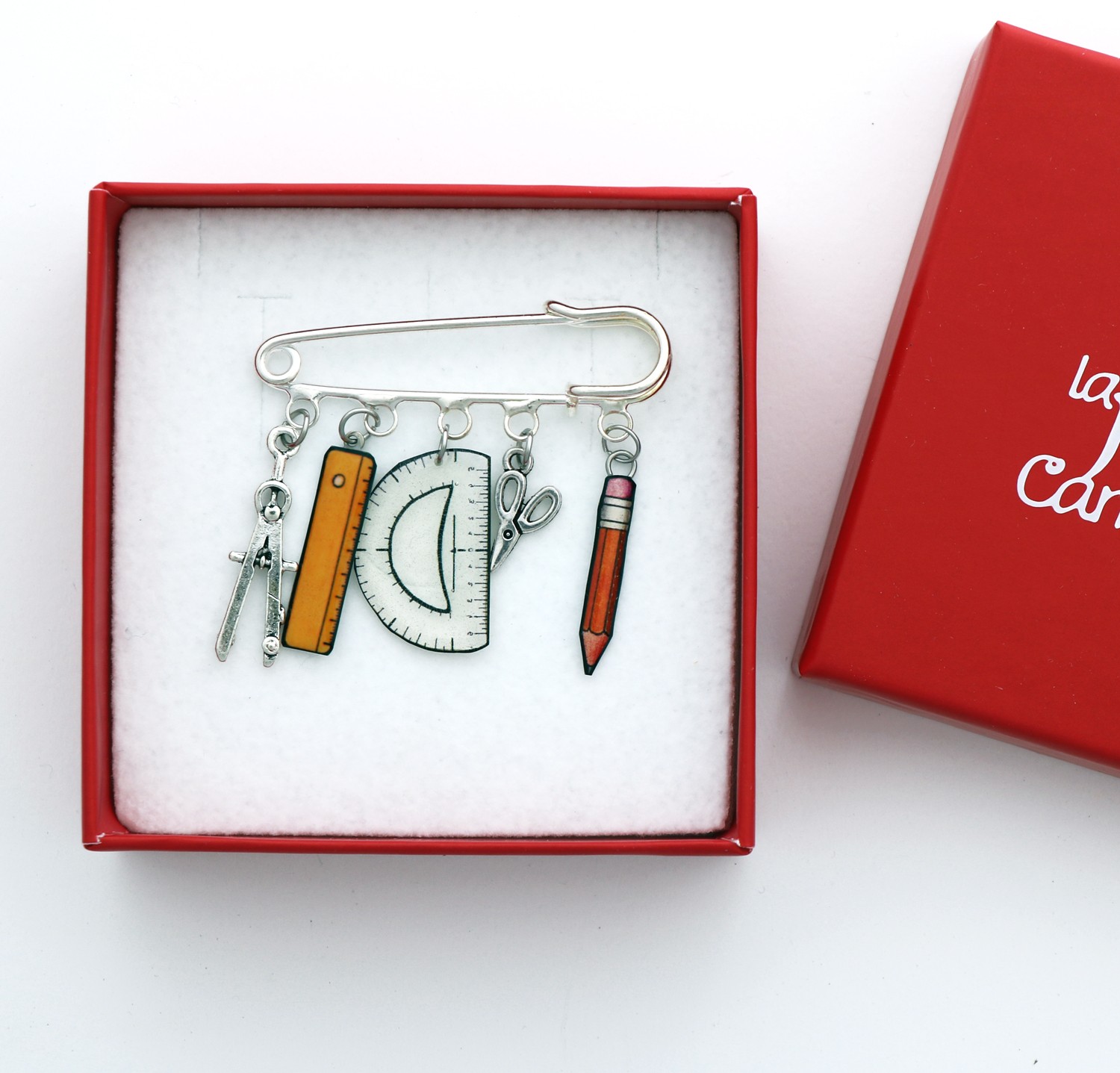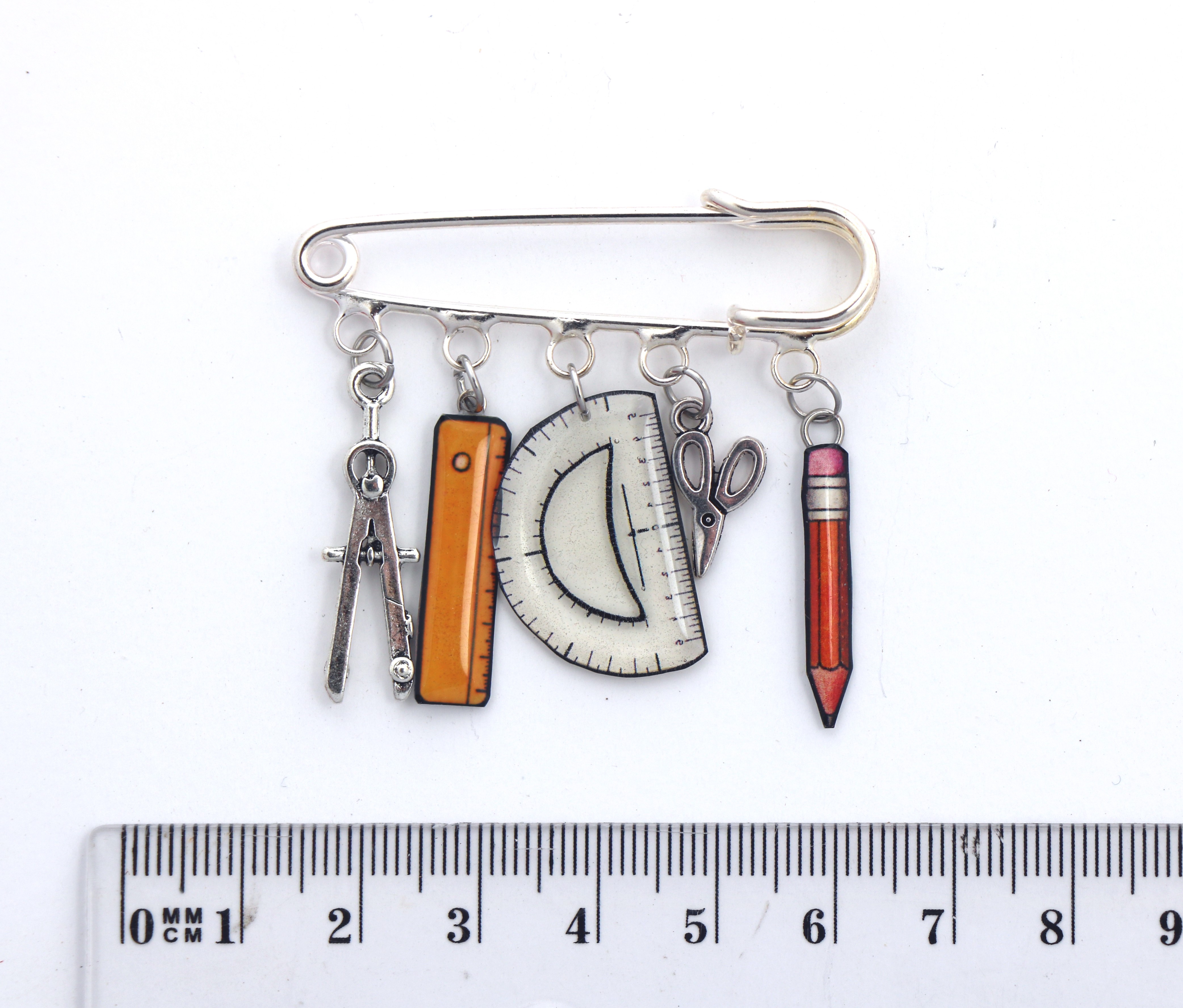Cette broche épingle argentée réunit des éléments ludiques et symboliques : une règle, un rapporteur et un crayon en résine, associés à un compas et des ciseaux en métal argenté.