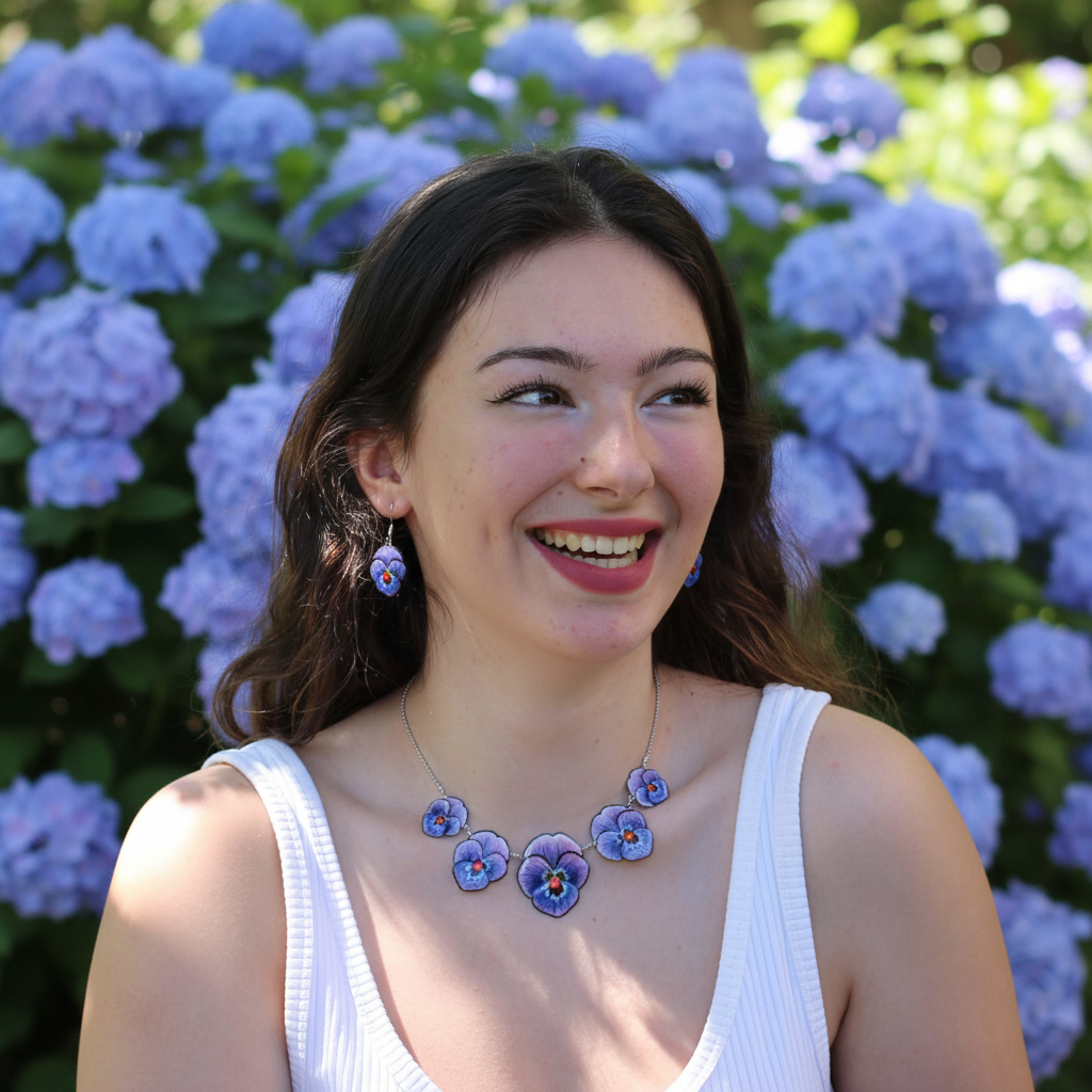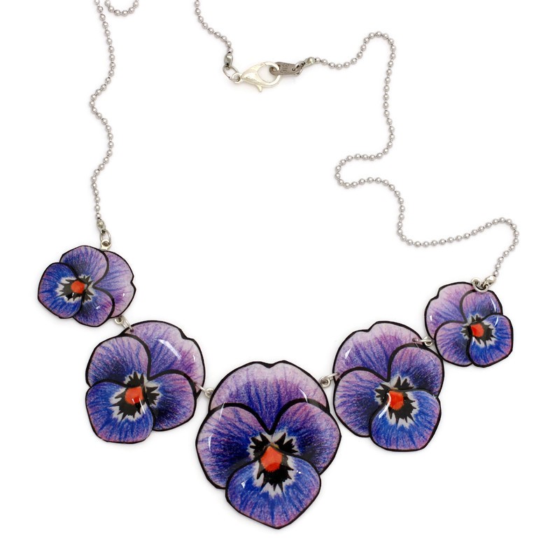 Mettez une touche de poésie à votre tenue avec ce grand collier artisanal orné de cinq pensées violettes en résine.