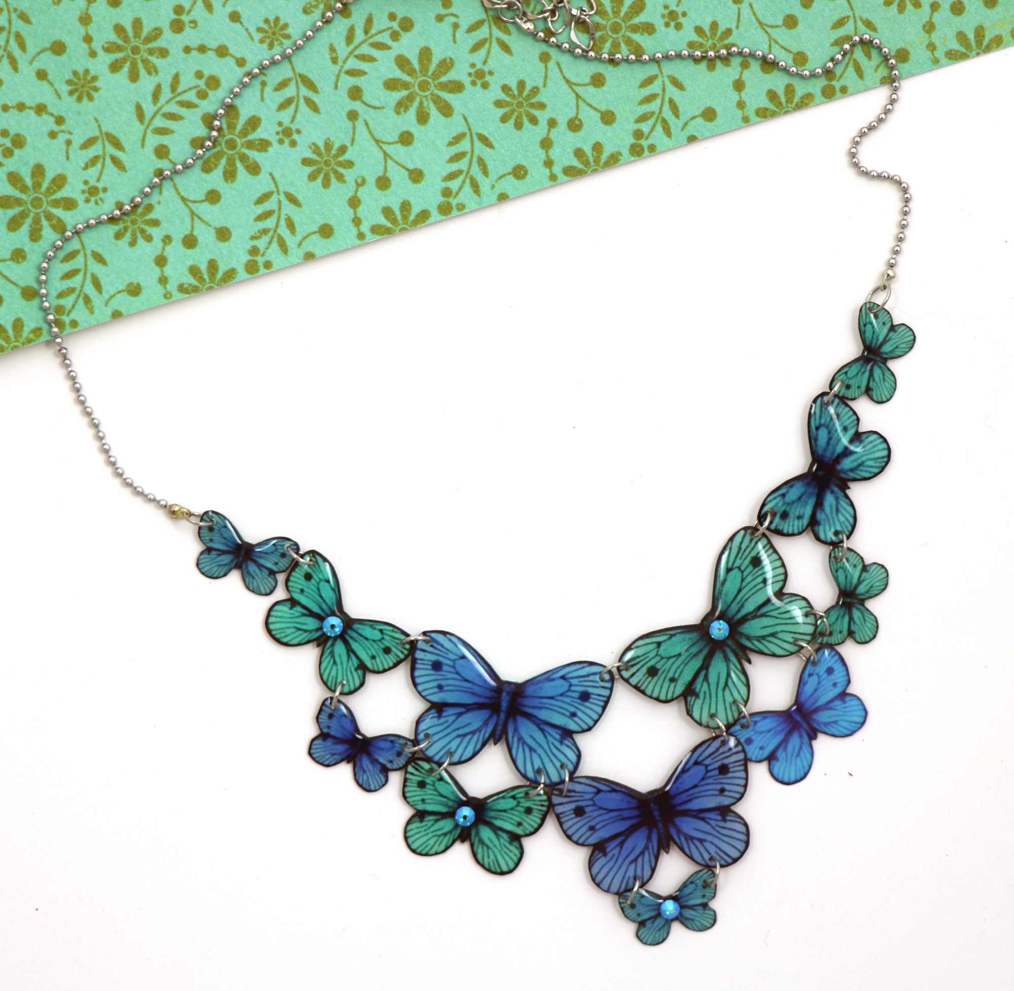 Ce collier spectaculaire “Papillons Bleus” réunit plusieurs papillons en résine aux nuances bleu, certains parés de strass scintillants qui captent la lumière à chaque mouvement.
