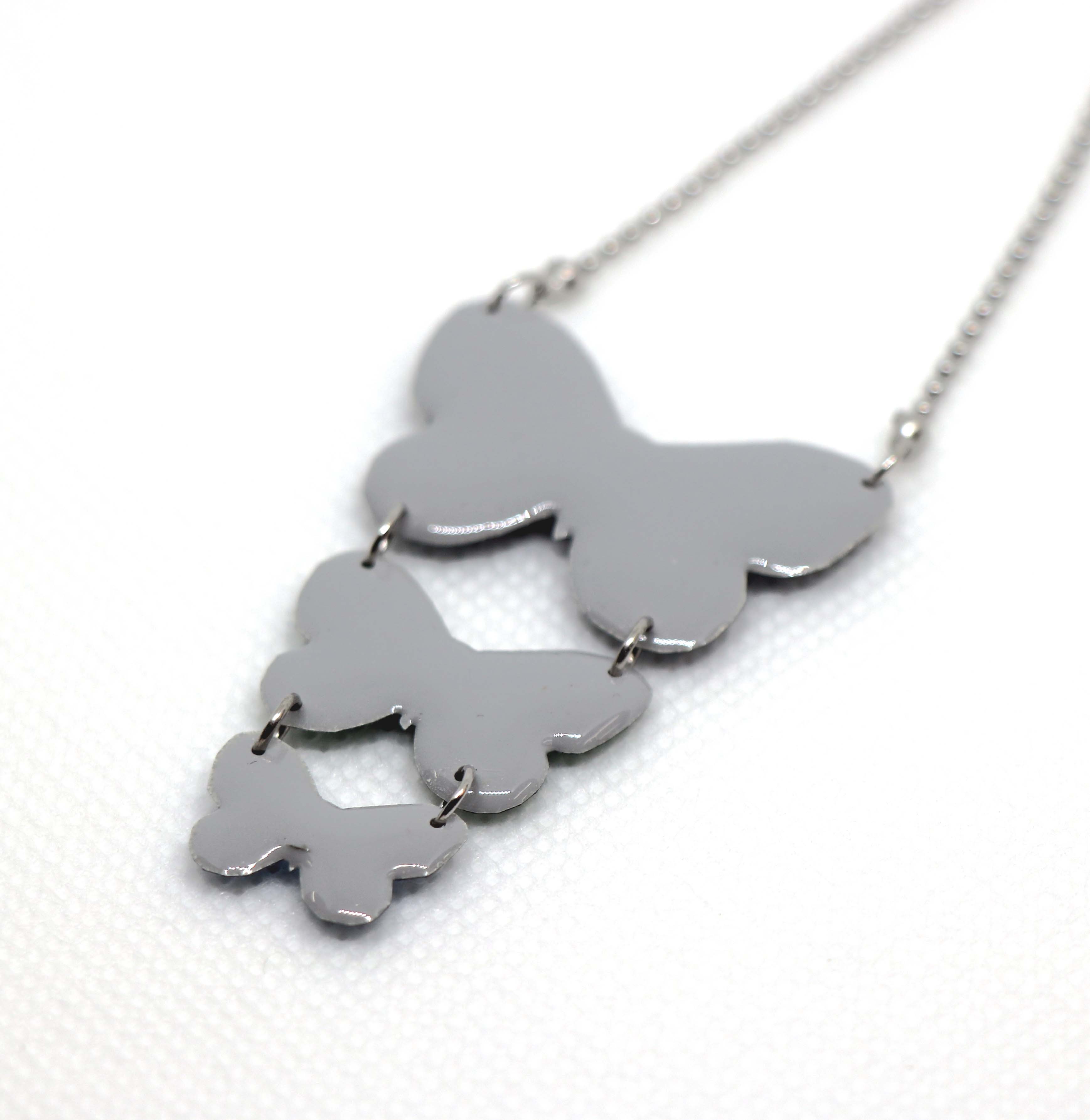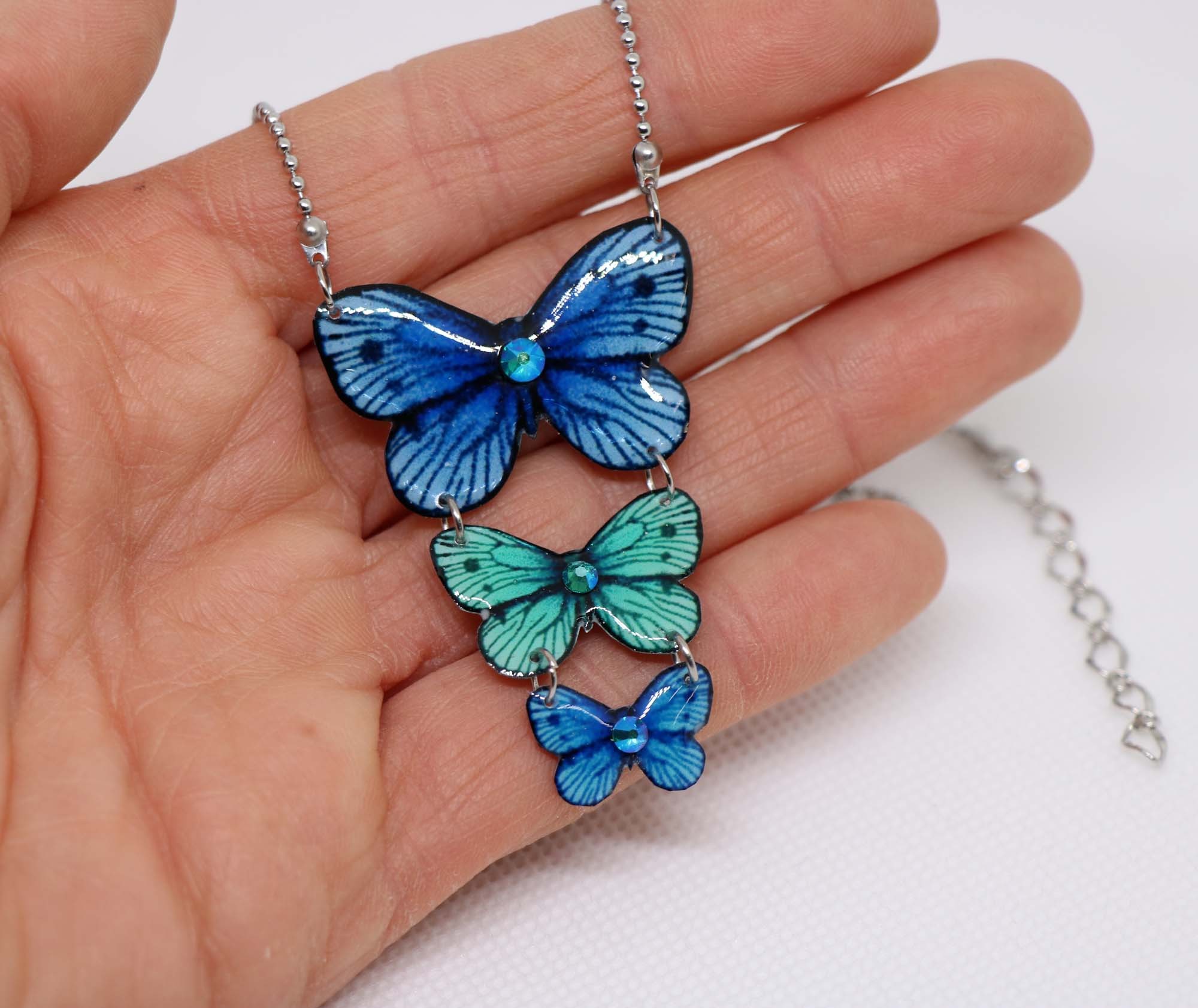 ✨Élégant et raffiné, ce collier met en valeur trois papillons bleus en résine, chacun orné d’un strass scintillant qui capte la lumière avec délicatesse. Le dos en résine grise apporte une finition soignée et discrète, pour un bijou harmonieux sous tous les angles.