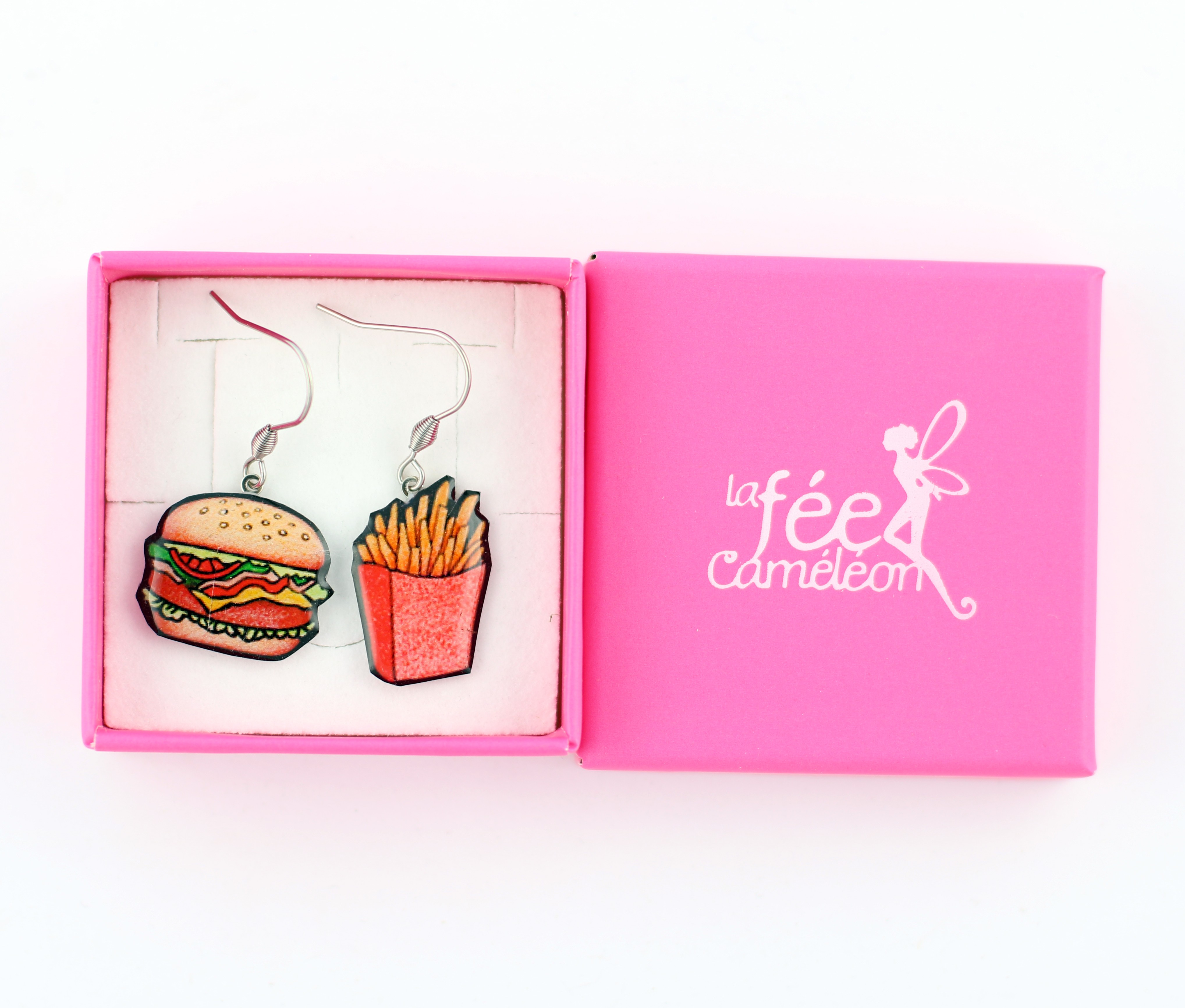 Boucles d’oreilles dépareillées (1 hamburger, 1 cornet de frites)