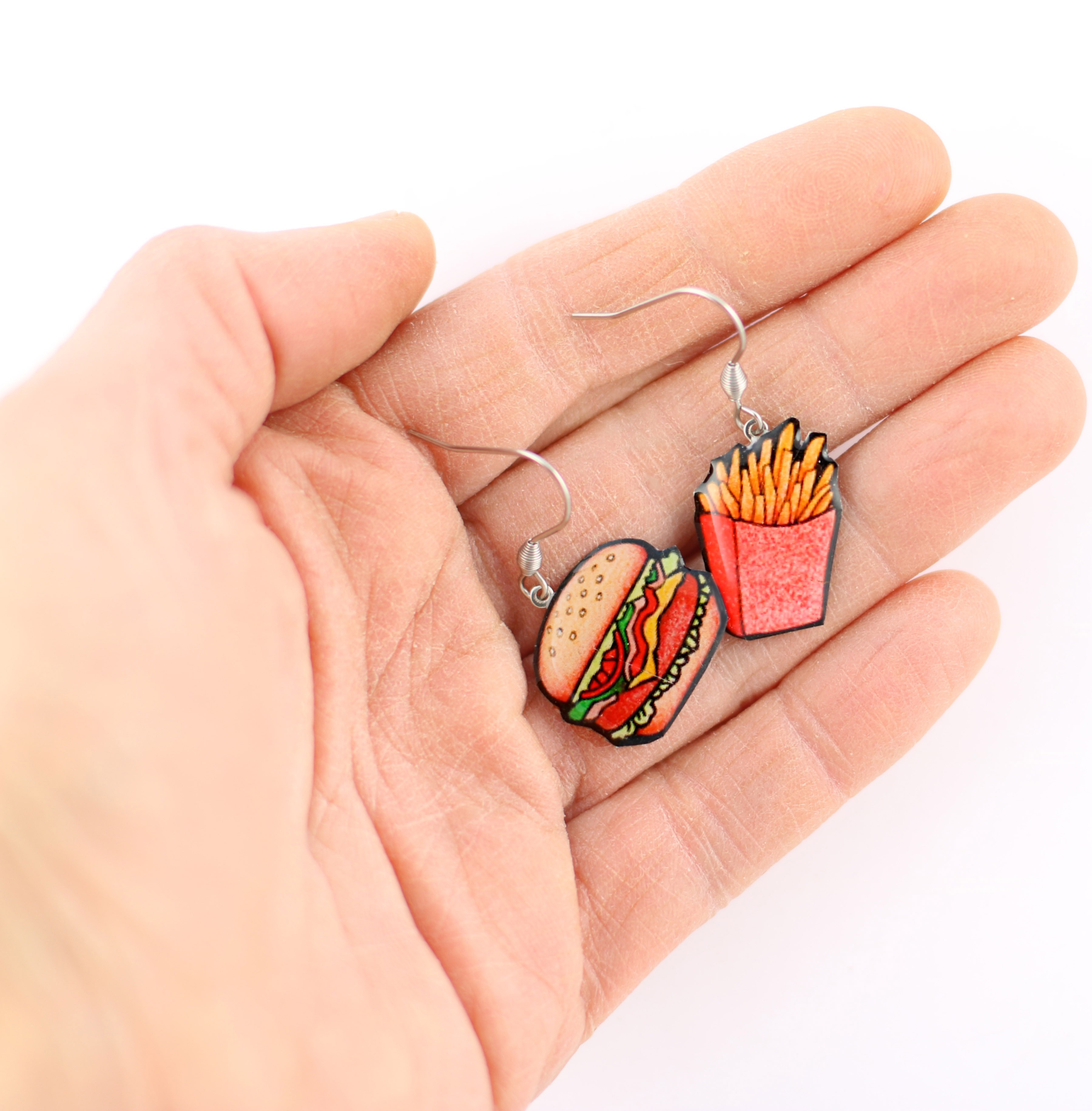 Ces boucles d’oreilles en résine colorée représentent un hamburger juteux et un cornet de frites croustillantes.