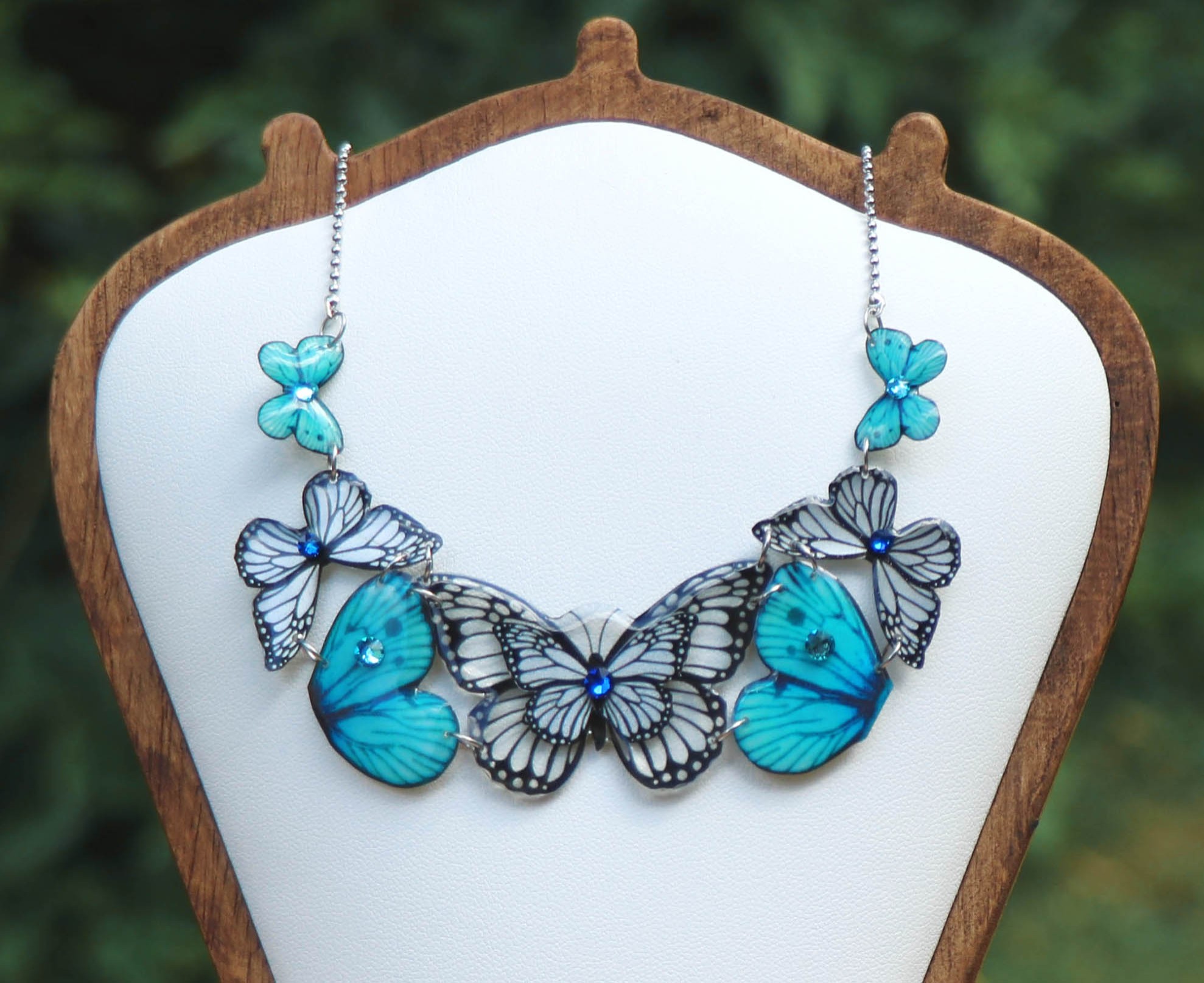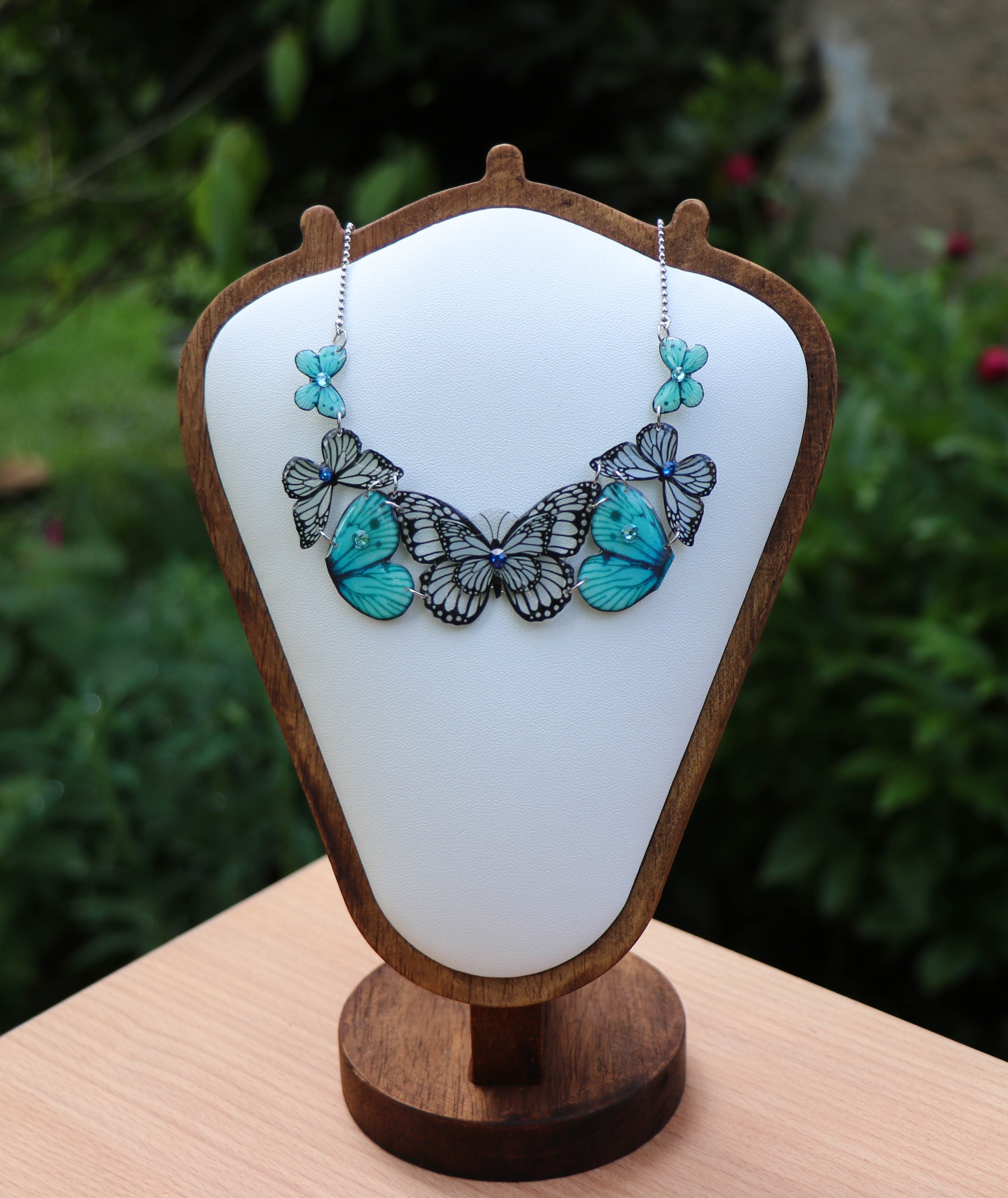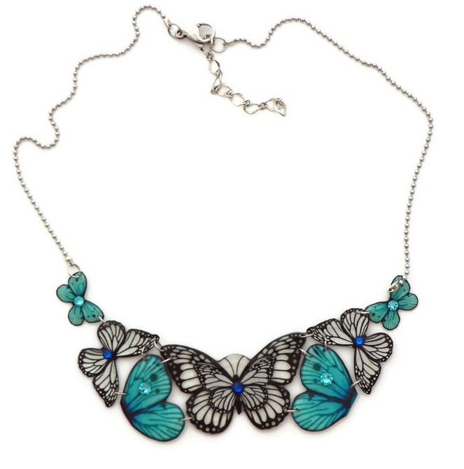 Apportez une touche de féérie et d’élégance à vos tenues avec ce collier délicat, composé de papillons en résine bleus, transparents et argentés, sublimés par de fins strass scintillants.