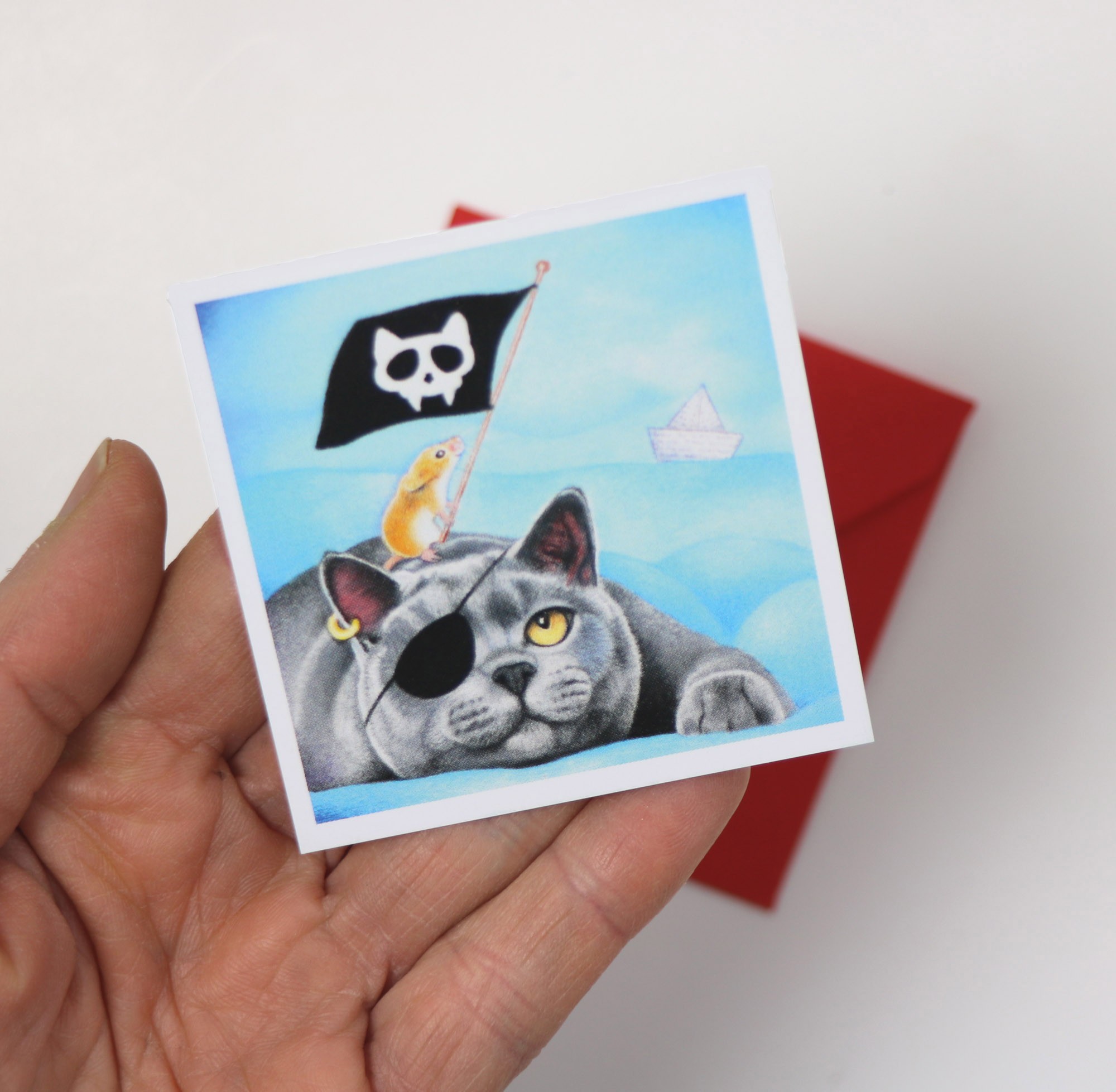 Ce gros chat pirate, l’air faussement féroce, laisse trôner sur sa tête une souris matelot brandissant fièrement son drapeau noir.