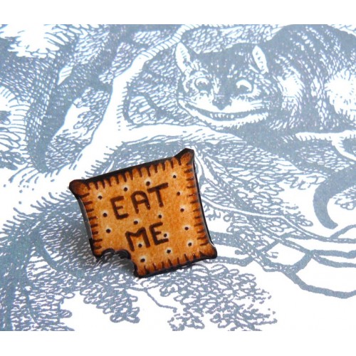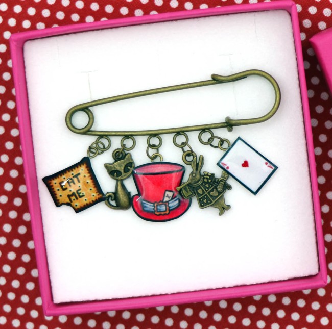 Broche Alice au Pays des Merveilles – Gâteau “Eat Me”, chapeau, as de cœur, chat et lapin en métal et résine