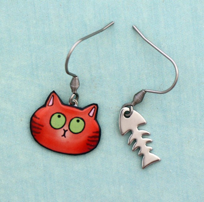 Boucles d'oreilles dépareillées chat roux et arête de poisson