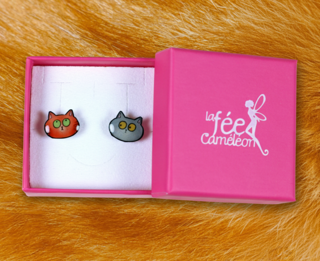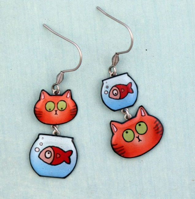 Boucles d'oreilles dépareillées, chat roux et poisson rouge,