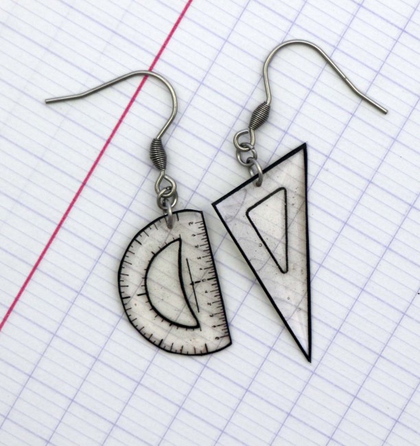 Boucles d'oreilles dépareillées, équerre et rapporteur, fournitures scolaires, géométrie