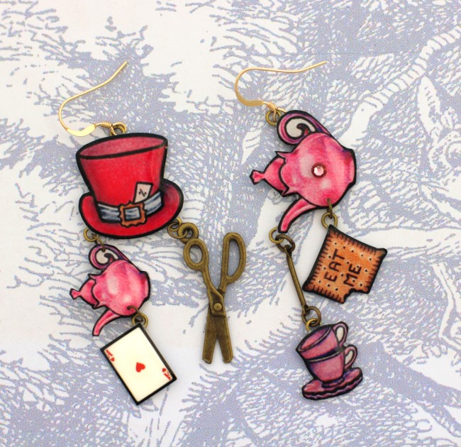 Boucles d’oreilles Alice au Pays des Merveilles – Chapeau, tasses, théières et ciseaux en résine et métal bronze, strass rose antique
