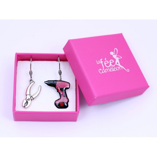 Boucles d'oreilles dépareillées bricoleuse, perceuse rose et pince en métal argenté