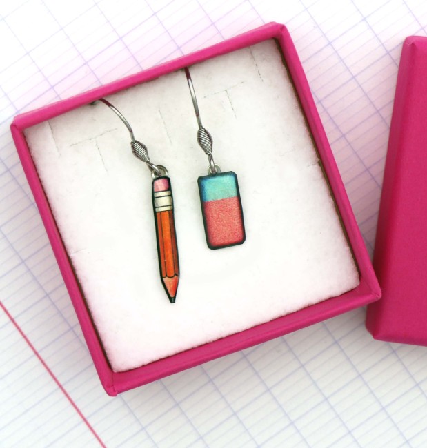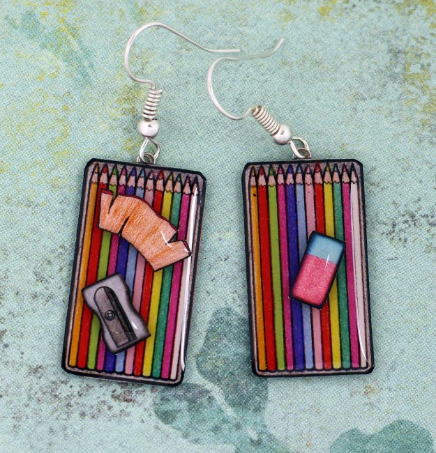 Boucles d'oreilles boites de crayons de couleur, gomme et taille-crayon