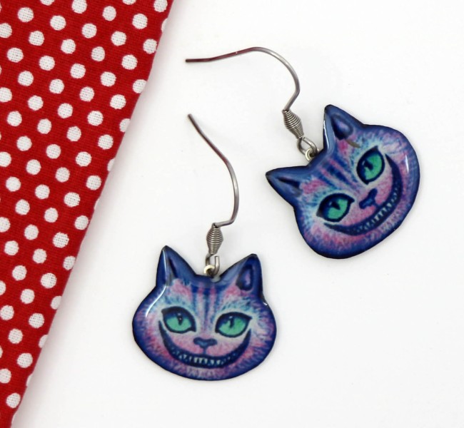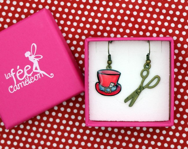 Boucles d’oreilles Alice au Pays des Merveilles – Chapeau du Chapelier et ciseaux en bronze, bijou dépareillé original