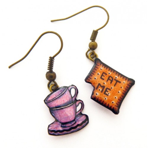 Boucles d'oreilles Alice au pays des merveilles, tasses empilées et biscuit "eat me"