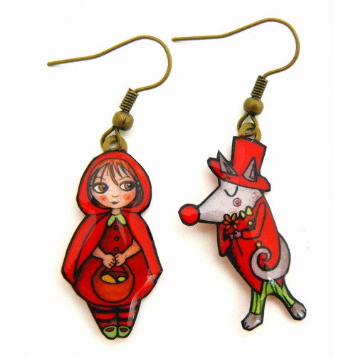 Boucles d’oreilles dépareillées "Petit Chaperon Rouge & Loup" – Bijou Poétique en Résine