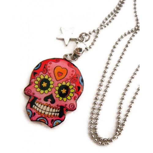 Pendentif tête de mort mexicaine rose et étoile argentée, chaîne à billes en acier inoxydable