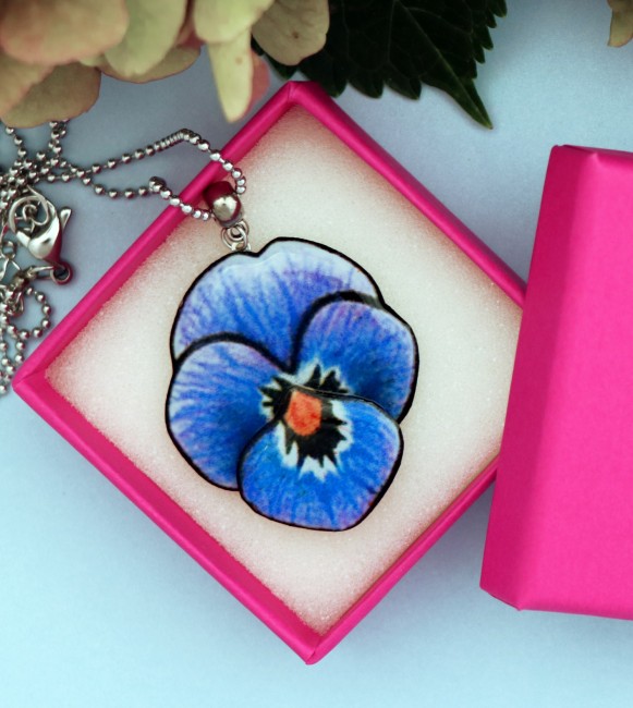 Grand collier cinq pensées violettes - Acier inoxydable et résine