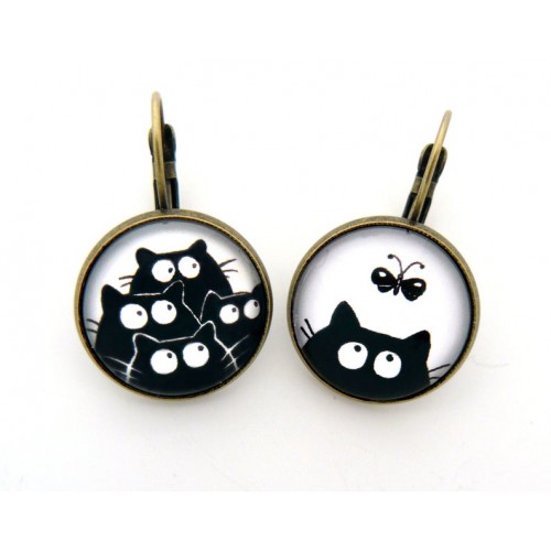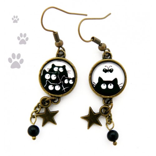 Boucles d'oreilles motifs chats noirs et papillons, noir et blanc, perles étoiles bronze, perles de verre noir