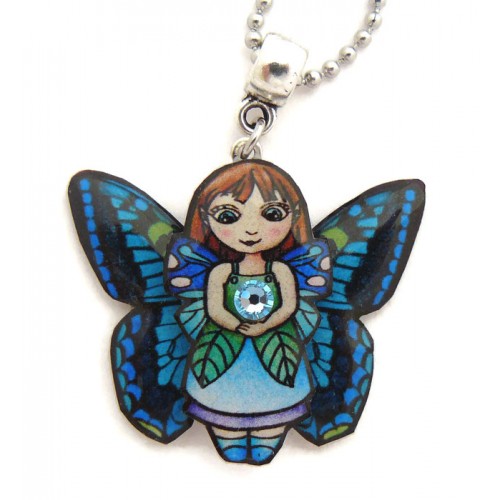 Collier trois papillons bleus et turquoises, strass bleus, acier inoxydable et résine
