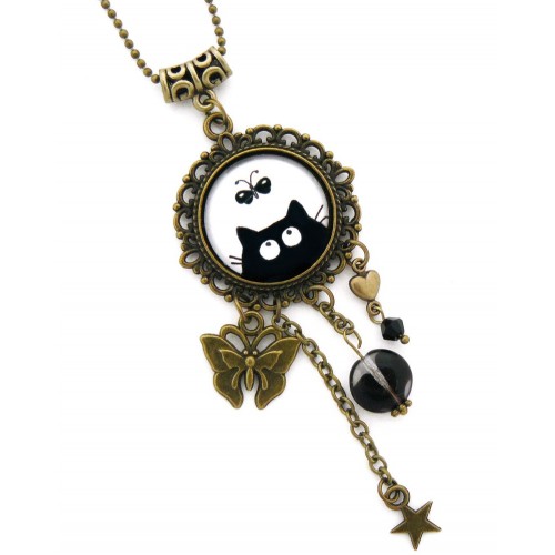 Broche épingle, chat noir, papillon, noir et blanc, perles de verre noires, aile, étoile, noeud noir à pois blancs